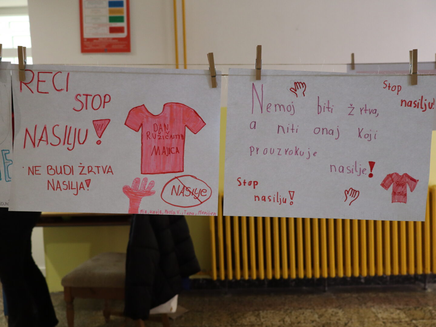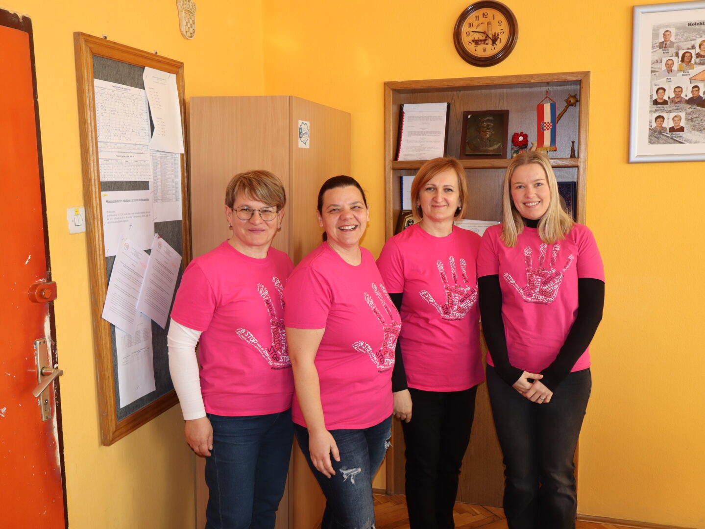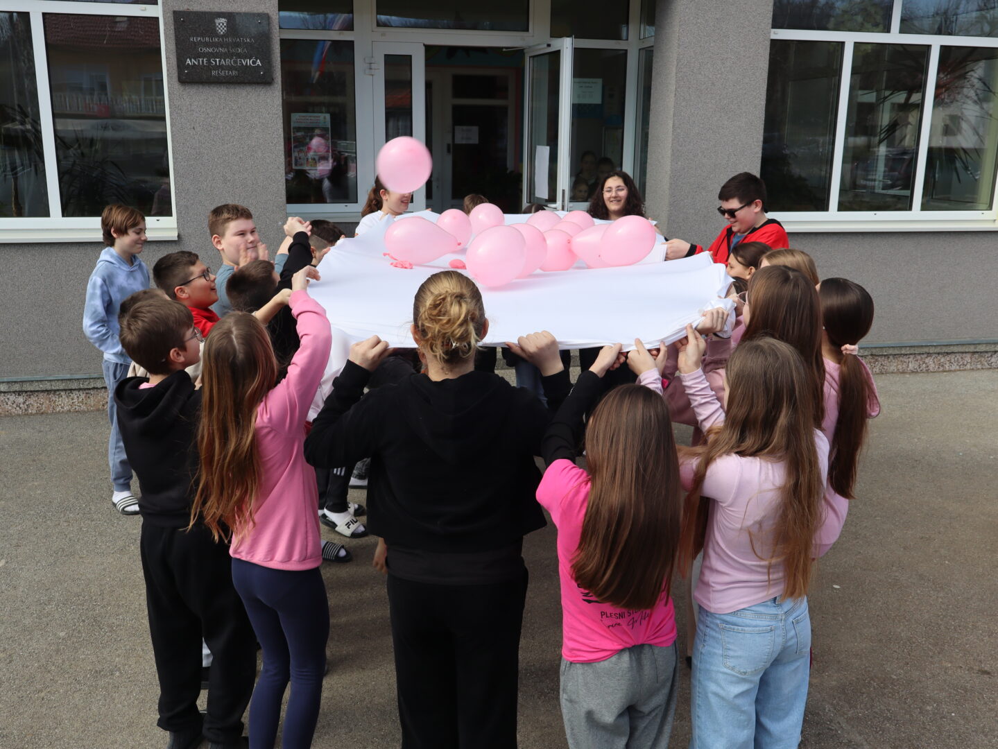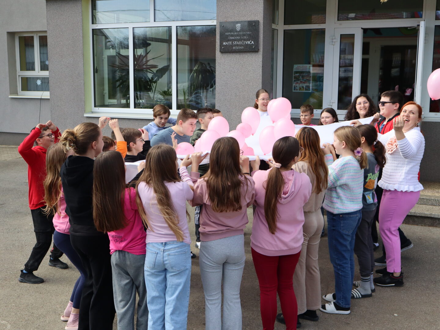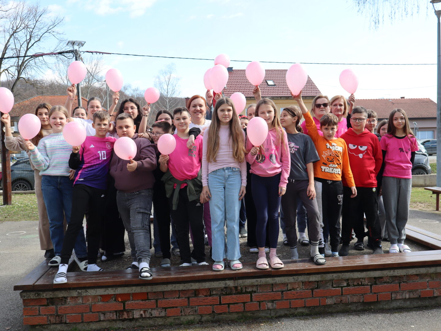 Pedagoginja Marija Dautović i učiteljica njemačkog jezika i povijesti Dragana Gorički su u suradnji s drugim djelatnicima škole potaknule naše učenike na promišljanje o ovoj uvijek aktualnoj temi tako što su odjenuli ružičastu majicu ili neki drugi modni dodatak. Oni učenici koji nisu nosili ništa ružičasto, dobili su bedž od papira kako bi i oni mogli pružiti svoju podršku. Vjeroučiteljica Vesna Hodak je na satu razrednika s učenicima 5. razreda provela radionicu s ciljem promicanja prijateljstva i mirnog rješavanja sukoba. Učenici su tijekom nastave toga dana pisali poruke protiv nasilja, koje su objesili na „Zid poruka“ u prizemlju škole. Također su učenici zaigrali igru s ružičastim balonima koja je imala za cilj zajedničkim snagama spriječiti balone da odlete te tako potaknuti zajedništvo i dobre odnose jednih s drugima.