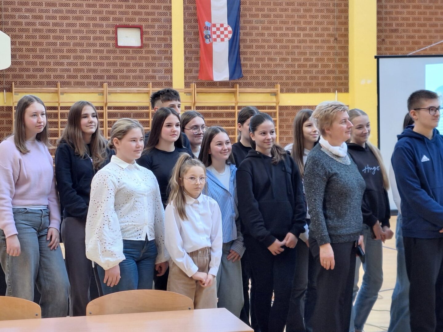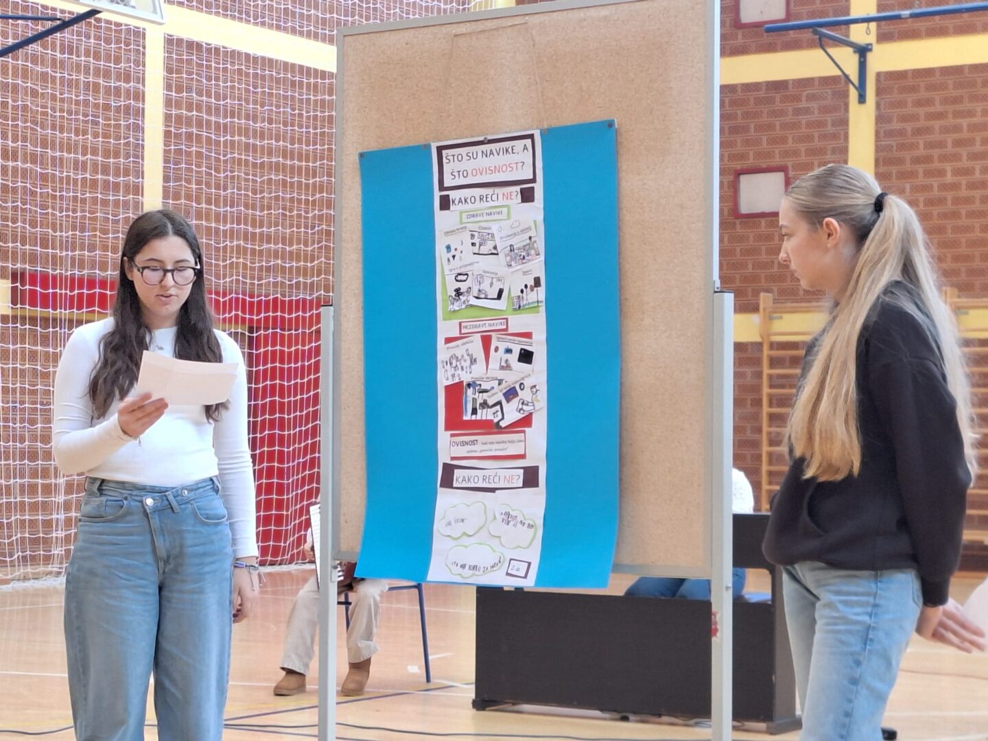 Povodom Mjeseca borbe protiv ovisnosti, Crveni križ svake godine organizira susret osnovnih i srednjih škola. Ove godine domaćin susreta bila je OŠ “Matija Gubec” Cernik. Predstavnice naše škole bile su učenice 8.a razreda Dunja Medenica i Iva Ugarković, koje su u pratnji pedagoginje Marije Dautović predstavile našu školu izlažući kreativni plakat učenika 2.a i 4.a razreda na temu „Ovisnost i navike“. Plakat su učenici radili pod vodstvom njihovih učiteljica Kristine Blažević i Slađane Ninković, a predstavljanje su učenice uvježbavale zajedno s pedagoginjom i vjeroučiteljicom Vesnom Hodak. Na izložbi radova sudjelovale su i naše učenice Eva Slišurić i Aneta Hodak, koje su glazbeno popratile Izložbu aktivnošću „Glazbom protiv ovisnosti“.