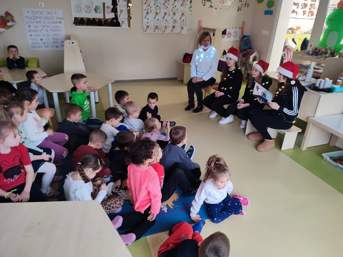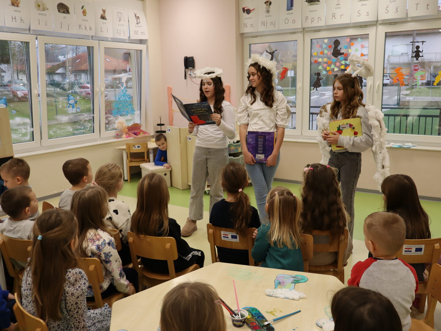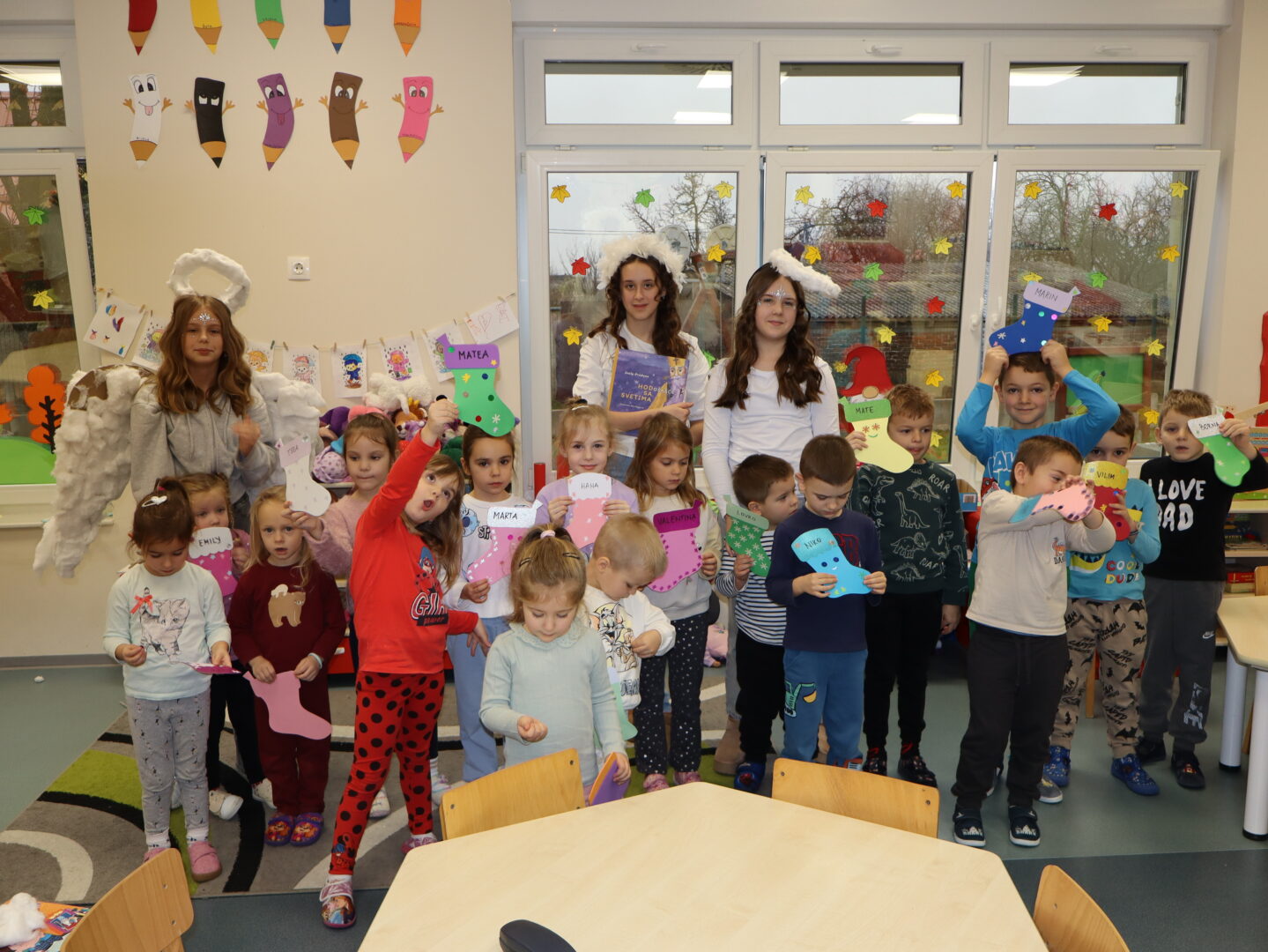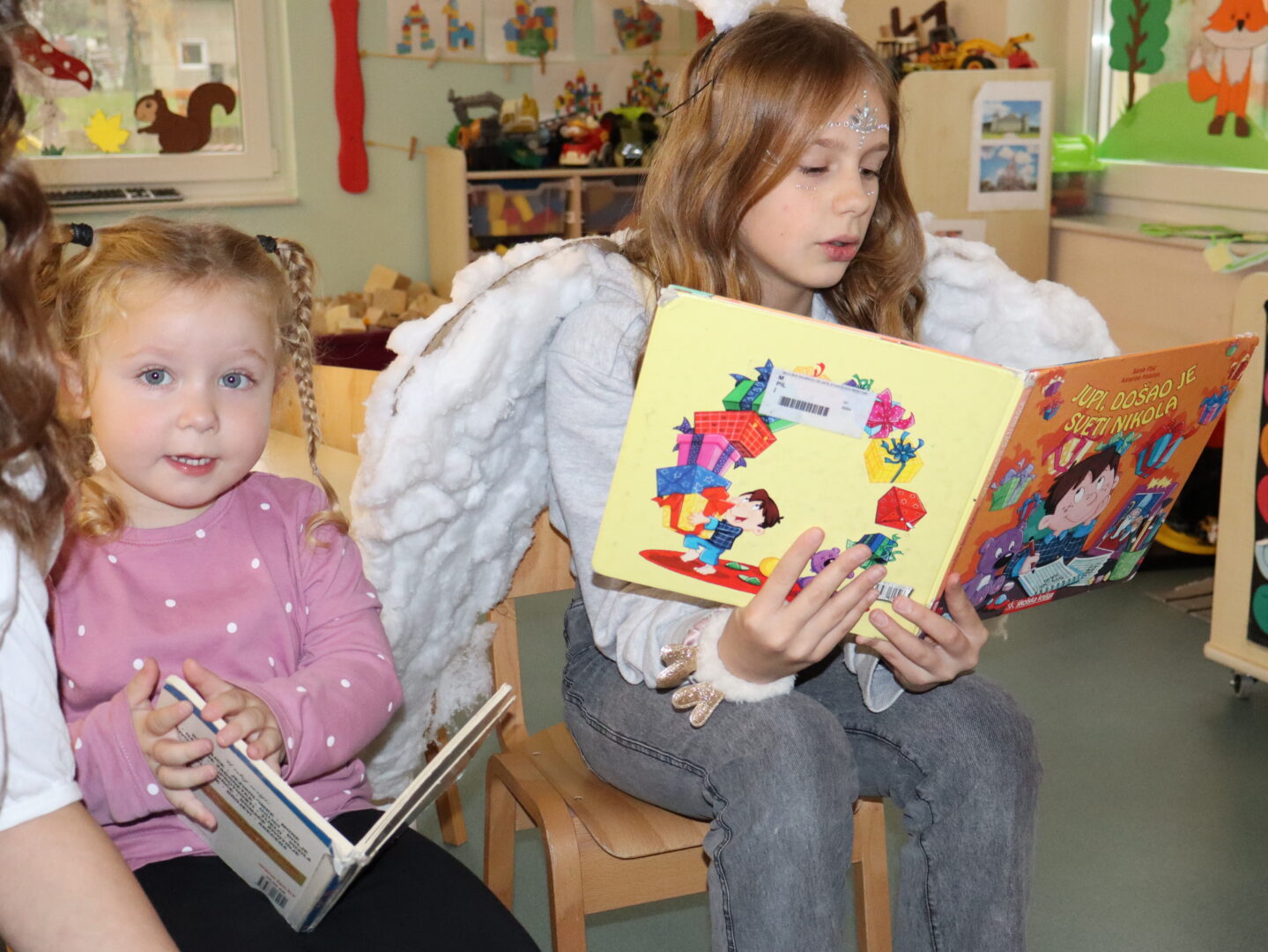Učenice su djeci pročitale prigodne slikovnice koje govore o dobroti svetog Nikole, darivanju i blagdanskom duhu. Čitanje je održano u jutarnjim satima u skupinama Ribice i Žabice, a djeca su aktivno sudjelovala – pažljivo su slušala, postavljala pitanja i prepoznavala likove iz priča. Posebno im je bilo zanimljivo razgovarati o tome kako se dočekuje sveti Nikola i što su poželjeli na dar. Za ovu prigodu učenice su izradile i odjenule kostime anđela tako da je čitanje i slušanje priča imalo posebnu draž.