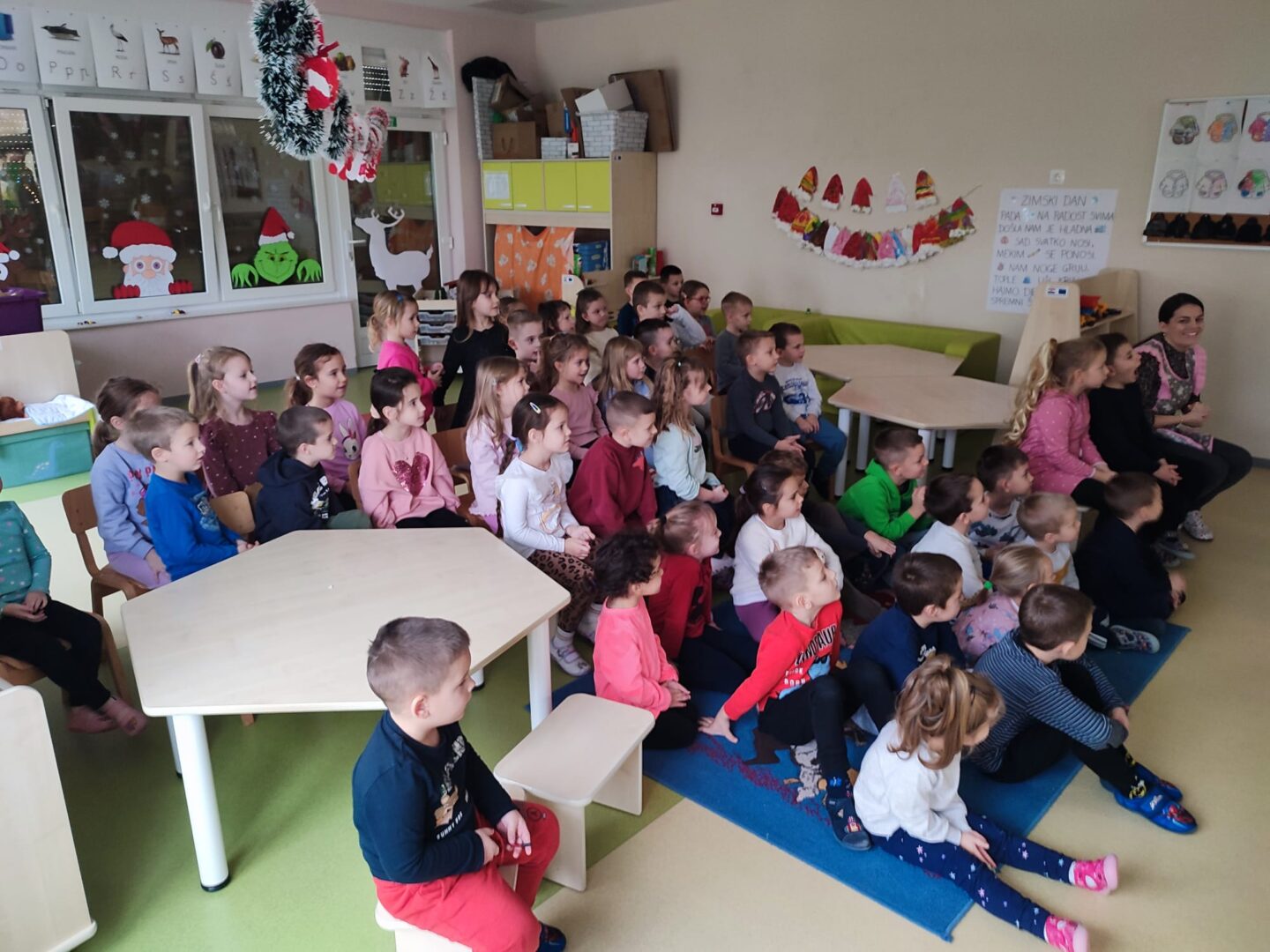 Nakon čitanja, učenice su djeci podijelile prekrasne čizmice s njihovim imenima i ukrasima koje su prethodno izradile od papira. Atmosfera je bila vesela i opuštena, a djeca su pokazala veliku radost zbog posjeta starijih učenica.