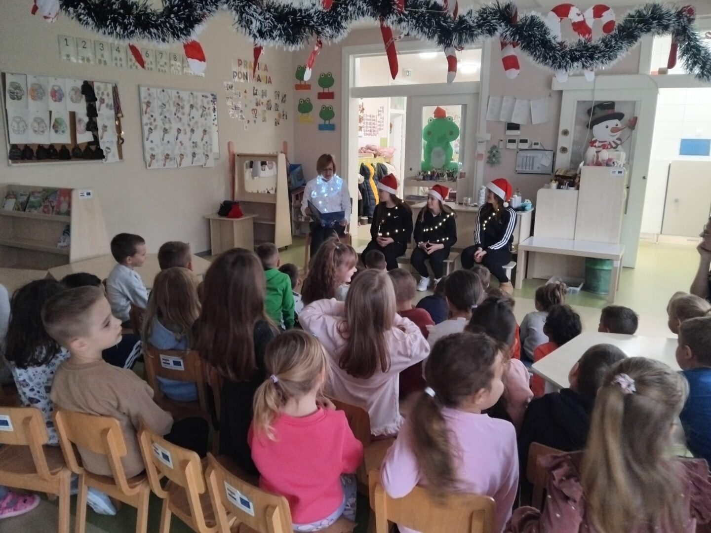Suradnja je nastavljena u predbožićno vrijeme. Naime, u srijedu, 17. prosinca 2025., učenice i knjižničarka ponovno su obradovale djecu iz skupina Žabice i Ribice. Čitale su im prigodnu božićnu priču „Božićna tišina“, a djeca su ih slušala s velikim zanimanjem i pažnjom. Tijekom čitanja vladala je ugodna i mirna atmosfera, a djeca su pokazala razumijevanje pročitanog sadržaja kroz verbalne i neverbalne reakcije.