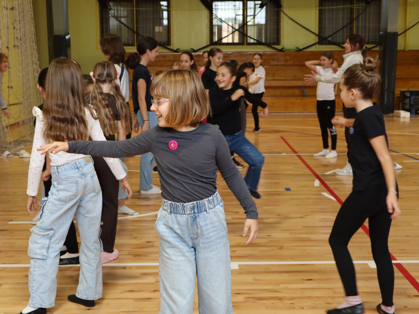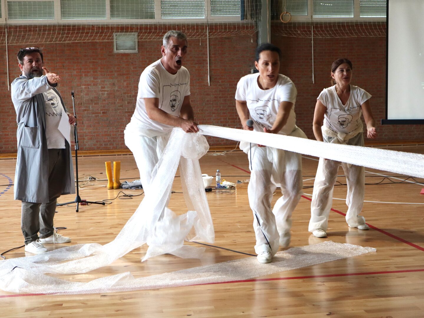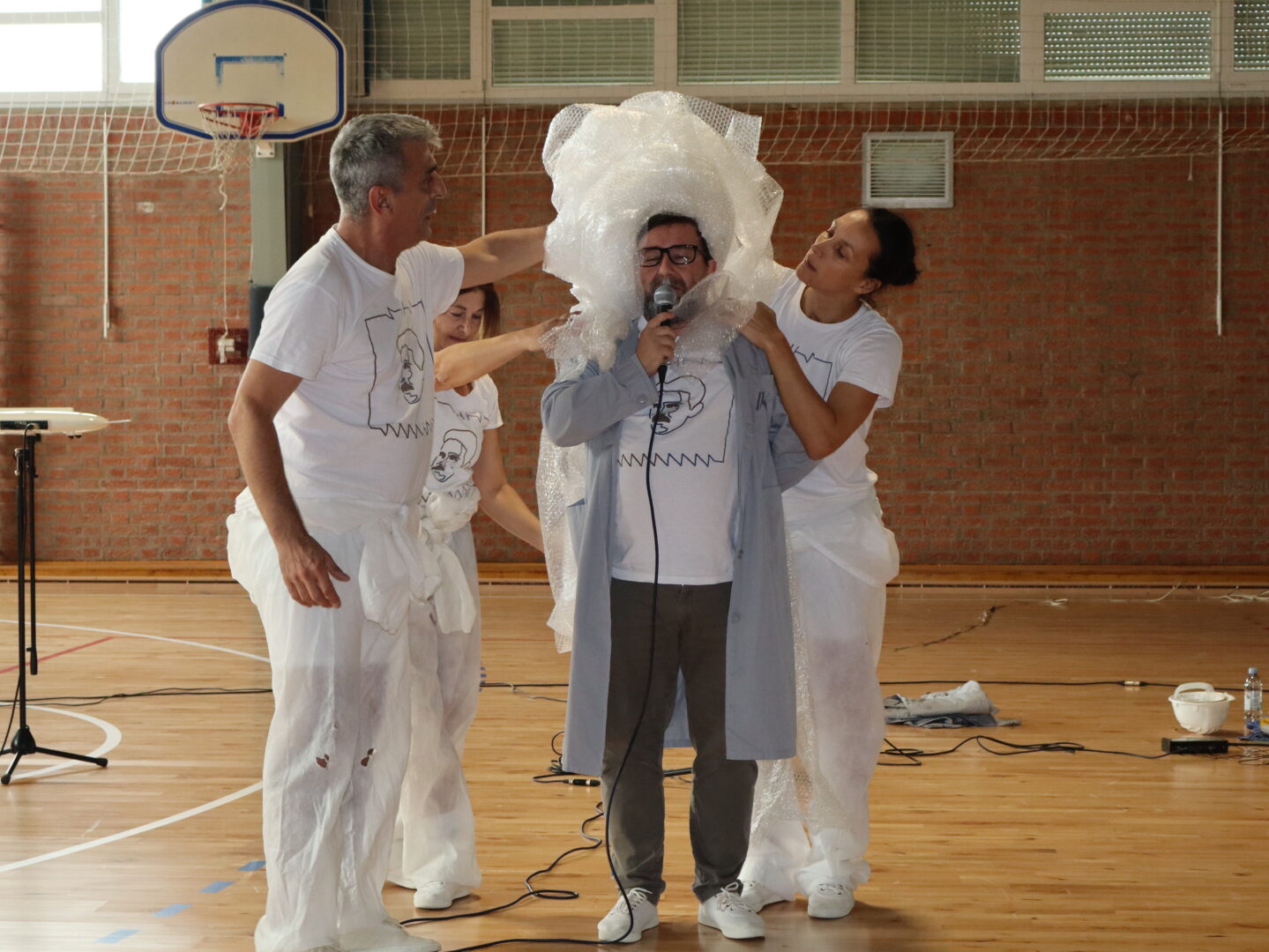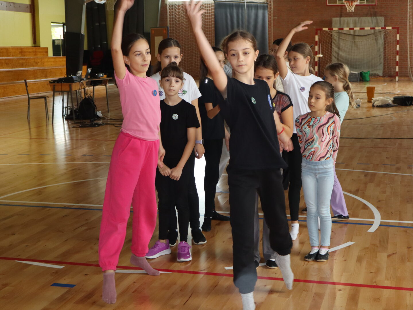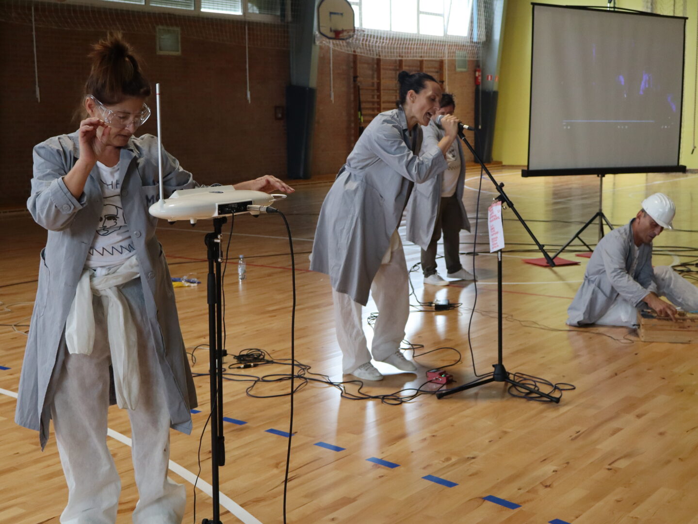 Program se održao u sportskoj dvorani i započeo je plesnom radionicom za manju skupinu učenika predmetne nastave i za učenike plesne skupine naše škole s njihovom voditeljicom Kristinom Blažević. Riječ je o više tematskih radionica, koje na koncu rezultiraju umjetničkim vizijama i kreativnim radovima te proizvode elemente pokreta, plesa, teksta, glasa i zvuka. Uz korištenje rekvizita iz predstave (neon lampa, antena kišoobran, antena, instrument teremin, loop pedala i mikrofon te instrument ”šiimunkofon”) umjetnici su primijenili različite pristupe u radionici. Time se djeci i mladima pruža izbor na odabir igre, teme koja se povezuje u stvaralačkom procesu i potiče ih se na njihovo kreativno izražavanje uz edukativan pristup.
